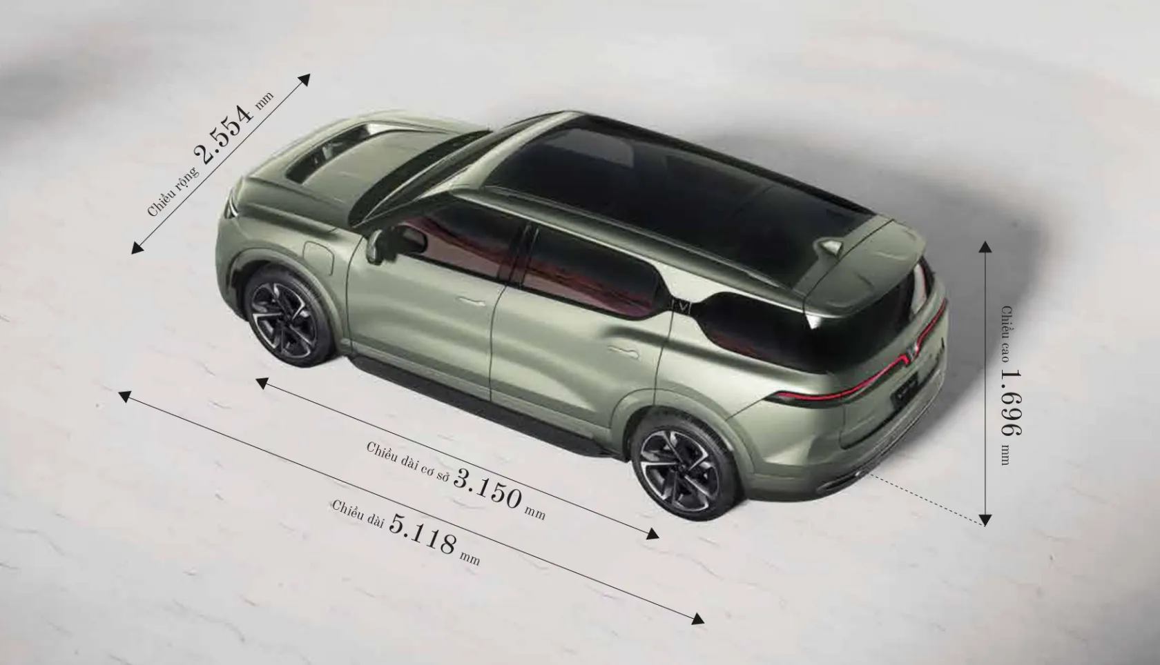 Vốn là mẫu xe đầu bảng của VinFast nên các thông số kích thước của VF 9 cũng lớn nhất trong chuỗi sản phẩm của hãng. Theo đó, chiều dài x rộng x cao của xe lần lượt là 5.120 x 2.000 x 1.721 (mm), tương đương với loạt mẫu SUV hạng sang như Lexus LX570, Mercedes-Benz GLS hay BMW X7.